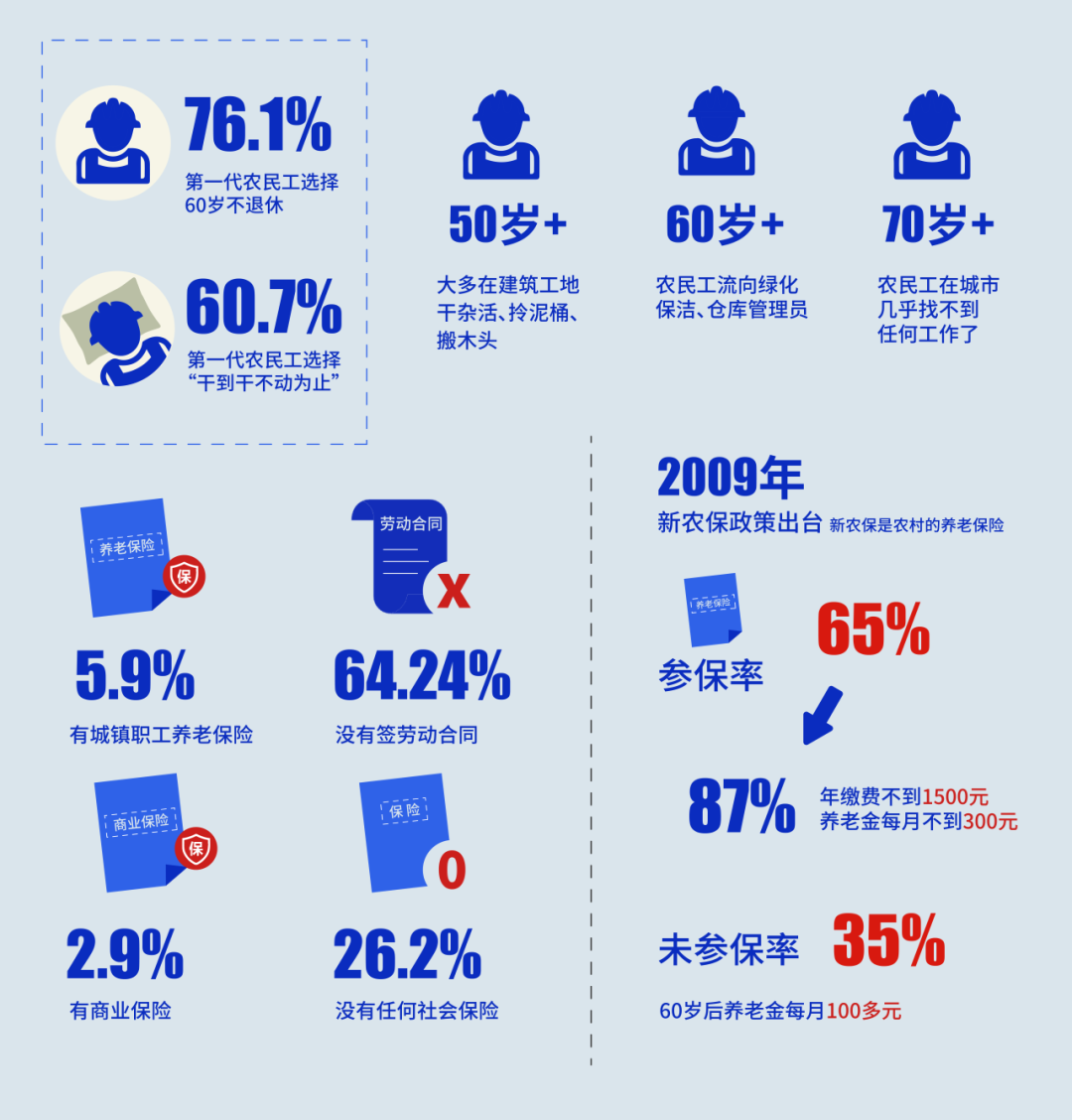 他们中的大部分人,在年轻时顾不上考虑晚年,只能把工资用在当下。2009年养老金政策出台,35%的人不相信或不理解这项政策如何与自己的未来有关, 是没有参保。他们60岁后只能领基础养老金,每月仅100多元。