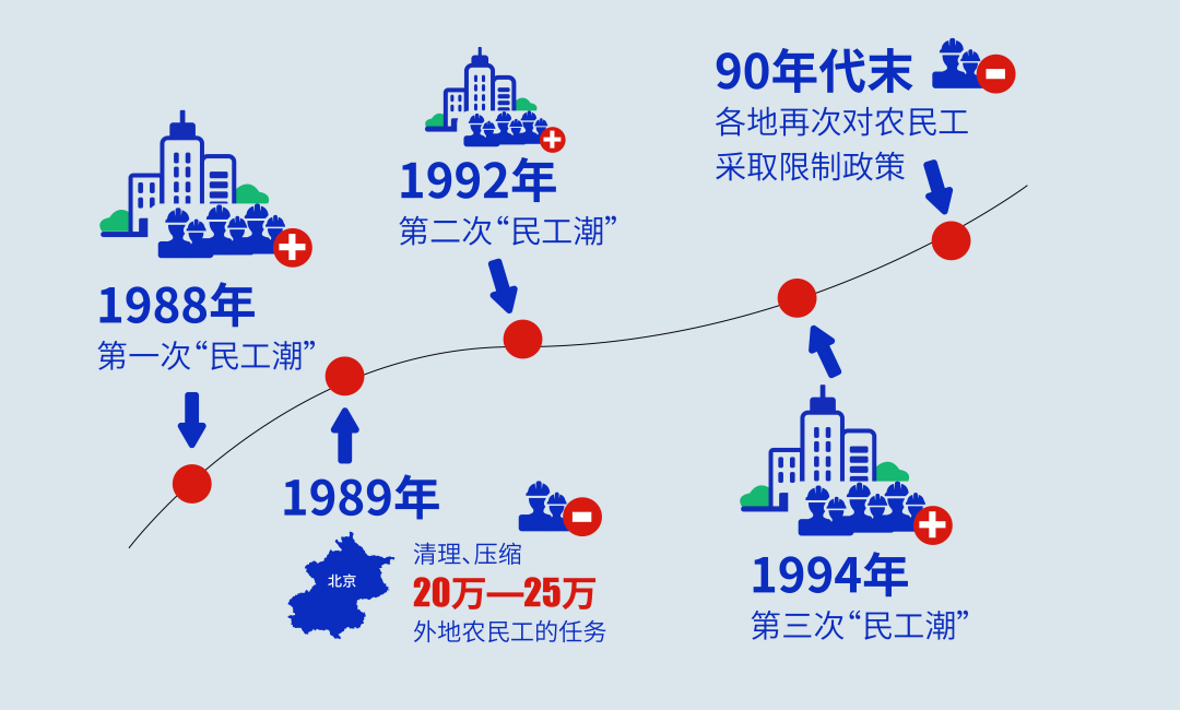 1990年,北京要求清退25万人,所有单位、企业都要每月填表报进度。那时,“民工潮”冲击了城市管理,同时城市正面临下岗潮,城里人也要再就业。农民工成了城市的“麻烦”。