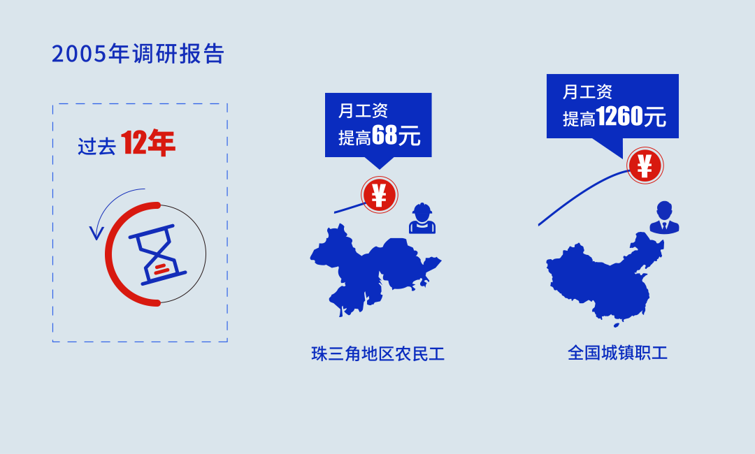 涨薪更无从提起。在改革带来红利的12年,1993到2005,珠三角地区的农民工月工资只提高了68元(而全国城镇职工平均提高了1260元)。考虑到通货膨胀,相当于他们在黄金年龄段,一直被降薪。