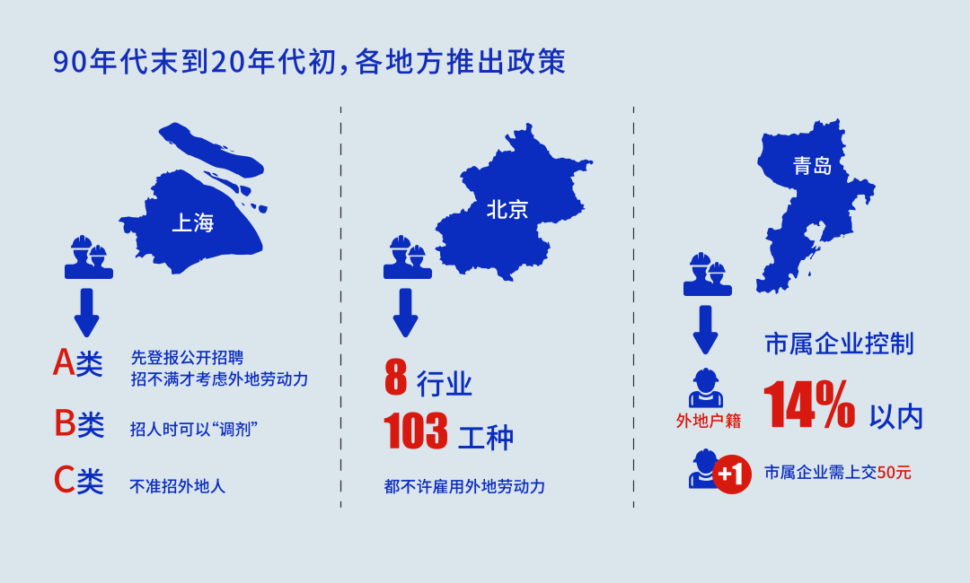 在北京,全市8个行业、103个工种,都不许雇用外地劳动力; 在青岛,市属企业每招一个外地人,还要交50块钱;