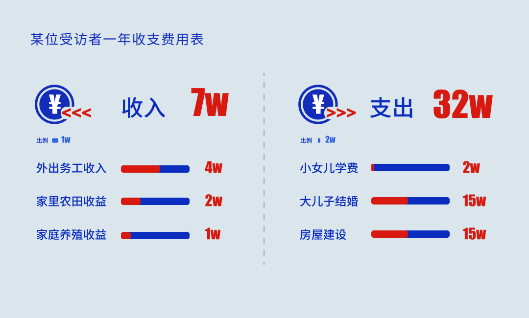 在北方农村,孩子结婚的开销在30到50万。儿子结婚这一年,一位农民工全年打工收入7万元,支出却高达32万元。他不得不借钱。