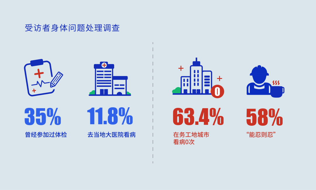 调研中,对于最担心的问题,61.4%的第一代农民工认为是“身体健康”,但仅有35%曾参加过体检;63.4%在务工地城市看病0次;58%的人都“能忍则忍”,仅有11.8%选择去当地大医院看病。