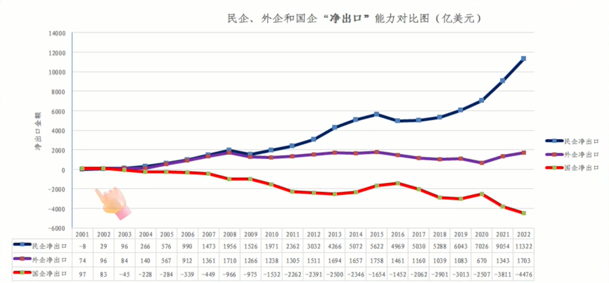 2007年民企净出口破千亿美元,2014年破5千亿美元,2022年突破万亿美元,达到了11322亿美元的惊人规模,整个增长势头,可以说令人叹为观止。外企方面,则体现了增长后劲不足的特点,2013年达到1694亿美元之后就进入了波动状态,2022年依然只是1703亿美元,这显示近年来外企无意于扩大在中国的出口能力。至于国企,加入世贸之后,所承担的角色逐渐变化,从出口企业逐渐变成了垄断性的大宗商品进口企业,然后转手卖给民营企业,靠挣差价为生。