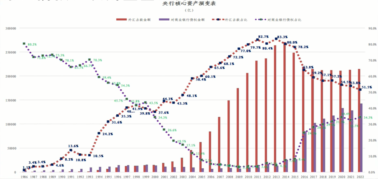 2022年,国企的净出口规模为负4476亿美元,这就意味着,加入世贸之后,民营企业迅速崛起,成为中国经济的绝对主导力量,完全取代了效率低下的国企的地位,并彻底打开了出口市场,这就是中国经济的新格局。这种新格局,当然也就顺理成章的改变了中国的货币发行机制。由于中国一直以来的外汇管制,挣到了外汇的民企和外企,不能直接使用这些外汇,它们必须把这些外汇兑换给银行,换回来人民币,才能在国内购买原料、支付工资,缴付税款。在绝大多数情况下,由于央行的出价最高,所以这些外汇大都直接兑换给了央行,央行直接印出人民币,来兑换走这些外汇,并在资产端形成所谓“外汇占款”。