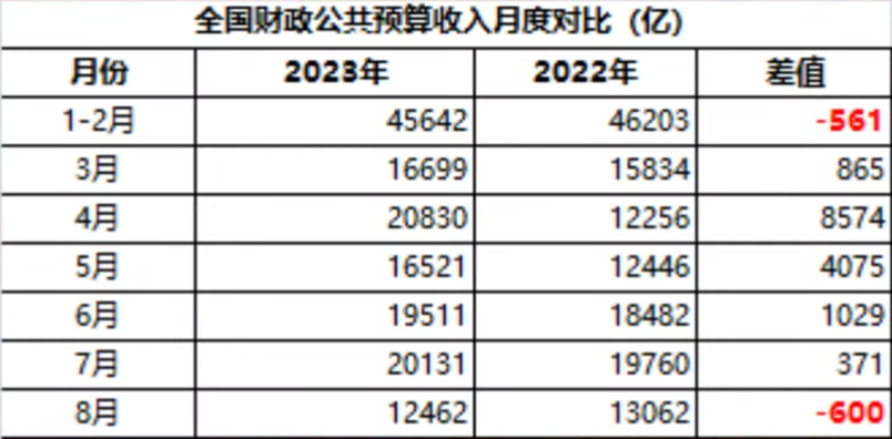 首先来看数据,今年1-2月份因为全民新冠渡劫,叠加春节因素,大部分行业乃至是政府都处于停业半停业状态,所以,这两个月的财政收入合起来较2022年同期有561亿的下滑。此后中国经济有了一波短暂的复苏,同时,去年缓缴的增值税在今年进行补缴,又拉高了税收收入,因此在接下来的3-4月中国在财政上的数据极为亮眼,每个月都在大幅增收,尤其是4月份的财政增收规模达到了惊人的8574亿。相信这个时候的中国政府一定是踌躇满志,觉得整个世界尽在掌握,没有困难不可克服,可惜5月份之后伴随着中国经济的扑街,即便是有着增值税补缴的因素,但是其它各项税收基本上都陷入了大幅萎缩的状态,这就造成了月度财政收入迅速丧失增长性,5月份的增量下降到4千亿,6月份1千亿,7月份300多亿,到了8月份,财政收入终于扑街了。8月份当月较去年8月份的收入减少了600亿。