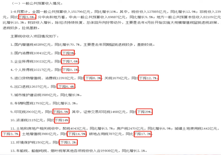 现在检查一下分项数据,除了增值税之外,绝大部分科目都处于剧烈的萎缩之中。1-8月份,非税收入下降3.6%。非税收入主要是罚没收入,也就是说现在经济萧条到连罚款都罚不到了,消费税下降9%,这里体现的是真实的消费情况,老百姓确确实实没有了消费,当然承担的消费税就减少了,企业所得税减少7.6%,这意味着企业普遍挣不到利润了,个人所得税下降0.1%,幅度不大但这是在个人所得税征收方式调整之后的首次下降,具有历史意义。