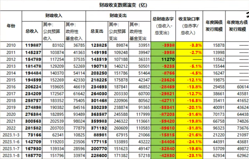 2020年—2022年的这三年财政赤字合计就达到了23.6万亿,此前十年合计只有19.5万亿,今年1-8月的财政赤字规模4.3万亿,预计全年下来必然超过7万亿。为了弥补赤字,中国政府一直以来都处于疯狂举债模式,现在仅国债和地方债券的余额合计就超过了65万亿,再算上城投债和事业单位的经营性债务,总债务规模必然超过100万亿。在接下来,中国政府终于要面对财政收入刚性下降的局面,也就是说,政府的现金流入大幅萎缩,很可能要断现金流。