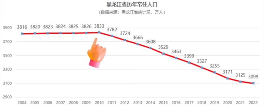 近十年来东北所有省份的人口都在大幅减少,而黑龙江的人口缩减规模位列东北之首,2010年黑龙江人口达到峰值的3833万,此后一路缩减,到2022年已经减少到了3099万,降幅达到了19.1%。12年的时间,合计减少了734万人,年均减少61万人。在这种人口持续大幅减少的背后,在黑龙江人民集体撤离故土的背后,一定隐藏着非常深刻的经济规律。