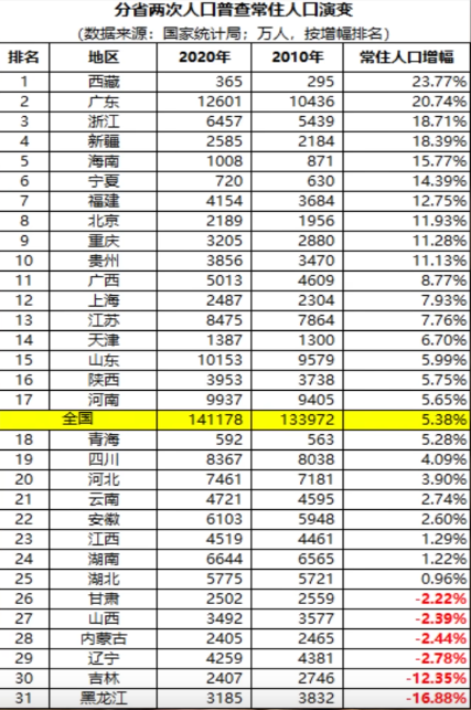 在本篇的最后,我要说的是一个更为宏大的问题—附表是2020年和2010年两次人口普查各省的人口演变情况,毫无疑问,东北三省排在了倒数三名,东北的萧条走在了全国的前面,它的人口流失问题也走在了全国的前面,东北流失的人口,没有任何疑问去了广东省、浙江省和海南省,它们的人口增幅分别排在了表格的第2、第3和第5。