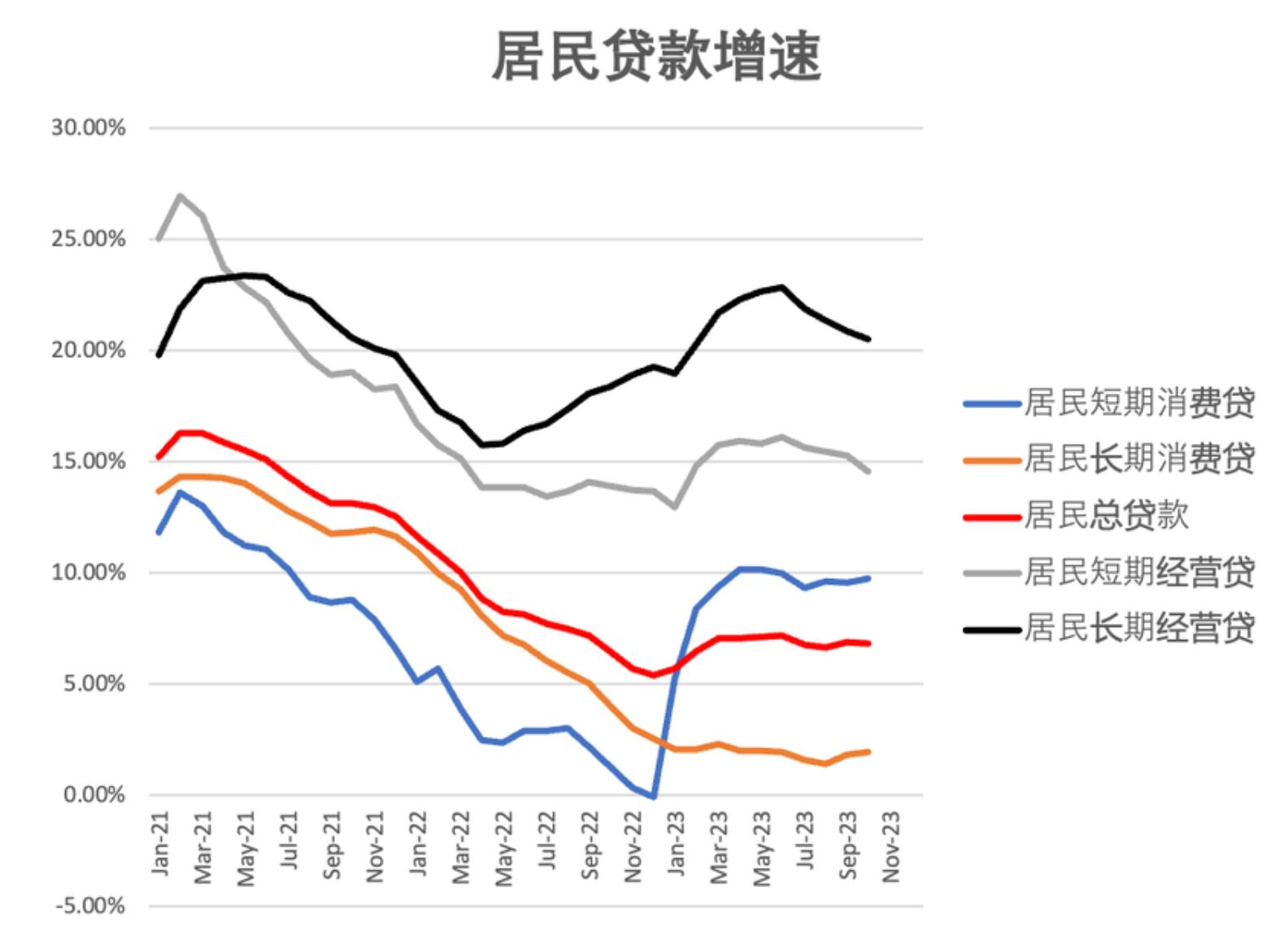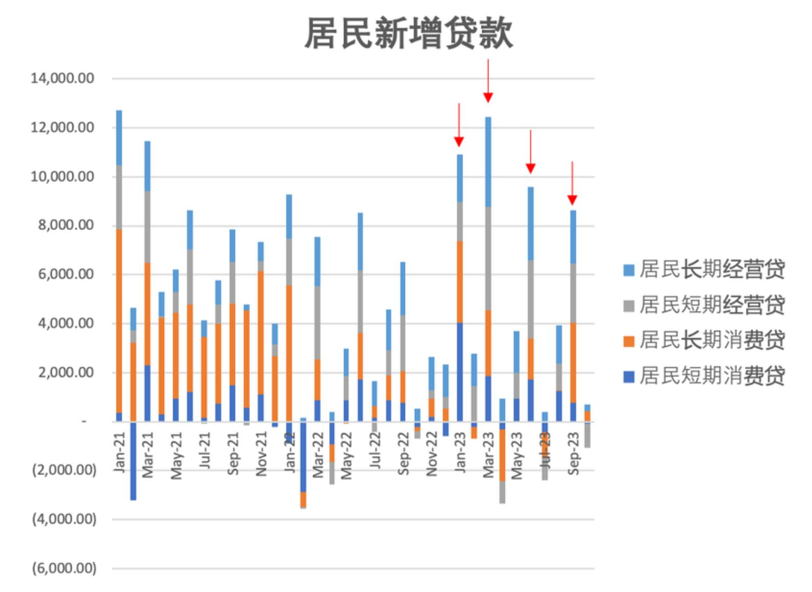 但是,刚刚过去的十月份,居民经营贷却大幅度萎缩。2023 年 10 月,居民短期经营贷减少了 976 亿,而居民长期经营贷也只增加了 268 亿,远远低于 9 月份的增长 2192亿。