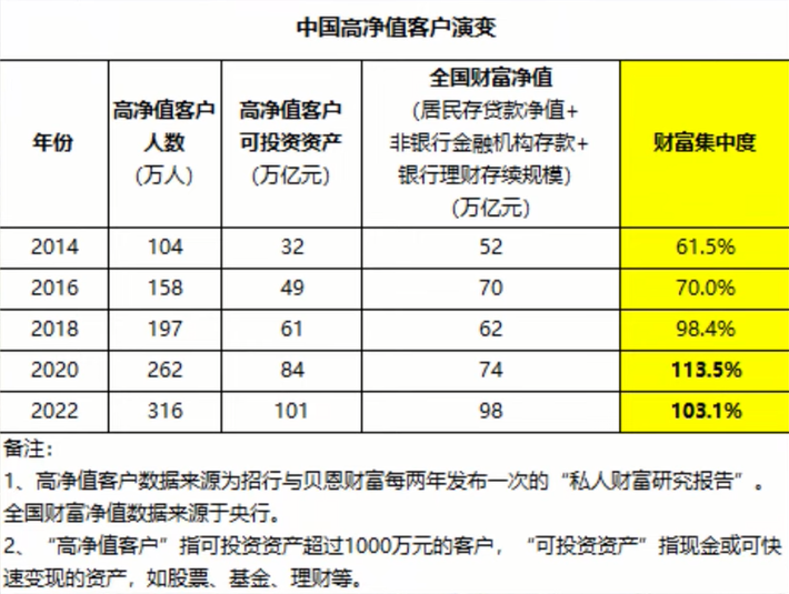接下来我们来看数据。这里主要的数据来源是招商银行与贝恩财富每两年发布一次的《私人财富研究报告》。招行是中国在零售业务方面做得最好的银行,没有之一,它的报告是完全可以相信的。截至2022年,中国财富净值在1000万以上的富豪总人数为316万,可投资资产总规模为101万亿,这里的可投资资产主要指的是现金以及可以迅速变现的资产,比如股票、基金和银行理财等。汽车、自住房产、企业固定资产等等这类难以变现的资产不算在内。也就是说,这101万亿的可投资资产大都以现金形式体现在了个人账户上,或者债券、基金等公司的账户上,或者银行理财产品的存量规模上,同时,这316万的超级富豪当然也没有个人负债。