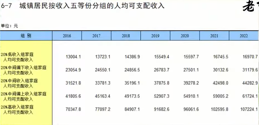 在明确这一点之后,我们来看中国人的收入情况。我这里给出的是统计年鉴中的人均可支配收入五等分数据表,人均可支配收入的概念就是老百姓的税后收入平均到家庭里的每一个人的身上。