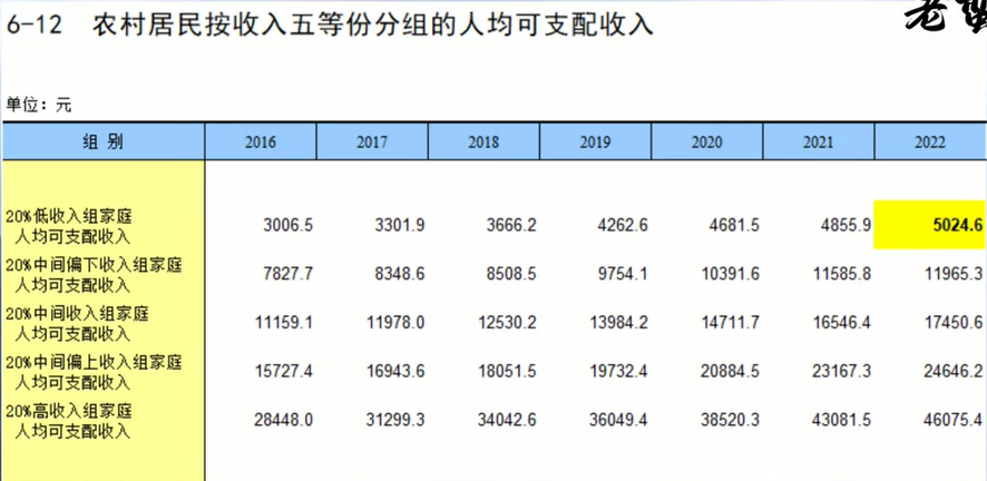 至于农村居民的收入,那就更加惨不忍睹。同样是统计年鉴中的家庭五等分人均可支配收入表,2022年,农村家庭人均收入最低的20%,年收入只有5024块钱,最高的20%,人均年收入也只有4万6千块钱,我们同样按照户均2.62人把这个人均收入折算回家庭收入。农村两成最低收入的家庭年收入1.32万元,夫妻合计月收入1100块钱;两成较低收入的家庭年收入3.13万元,夫妻合计月收入2600块钱;两成中间收入的家庭年收入4.54万元,夫妻合计月收入3800块钱;两成较高收入的家庭年收入6.46万元,夫妻合计月收入5400块钱;两成最高收入的家庭,年收入12万元,夫妻合计月收入10060块钱。