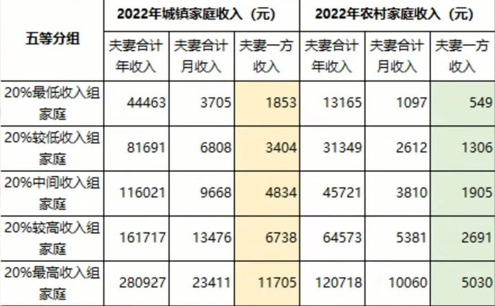 首先来看城镇居民的人均收入表。2022年城镇居民家庭人均收入最低的20%,只有1.7万,2020年人口普查的平均家庭规模是2.62人,城乡差别很小,并且还在持续往下降,这里就按2.62人算好了。这意味着城镇最低收入的那20%的家庭家庭年收入总共只有1.7万元乘以2.62人等于4.45万元,平均每个月3700块钱。按照相同的算法中国城镇家庭2022年的实际年收入分别为:两成最低收入的家庭年收入4.45万元,夫妻合计月收入3700块钱;两成较低收入的家庭年收入8.17万元,夫妻合计月收入6800块钱;两成中间收入的家庭年收入11.6万元,夫妻合计月收入9700块钱;两成较高收入的家庭年收入16.17万元,夫妻合计月收入13500块钱;两成最高收入的家庭,年收入28万元,夫妻合计月收入23400块钱。