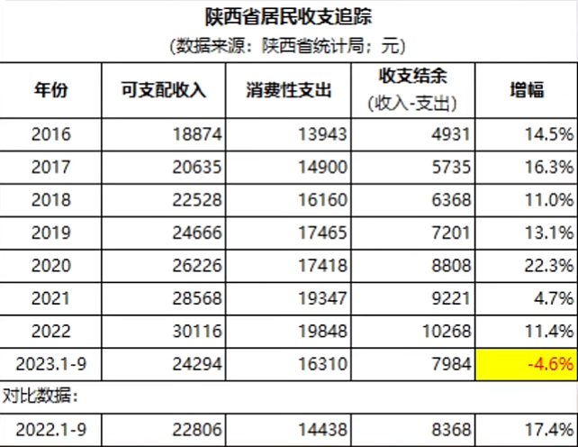 我从这组数据开始讲述陕西。根据陕西省统计局的数据,今年前三季度陕西省居民的收支结余,也就是人均可支配收入减去为了维持生存必须的消费性支出,剩下的结余部分为7984元。对比去年同期的8368元,降幅为**4.6%**。这是全中国范围内,有数据统计以来省一级的居民收支结余第一次出现下降并且这个降幅还不算低。收支结余是一个非常重要的概念,居民投资买房、旅游、进行奢侈性消费的资金来源全都是收支结余,现在陕西省居民的收支结余出现了有数据以来的第一次下降,这将给整个陕西的经济带来巨大的、无法抵抗的冲击。