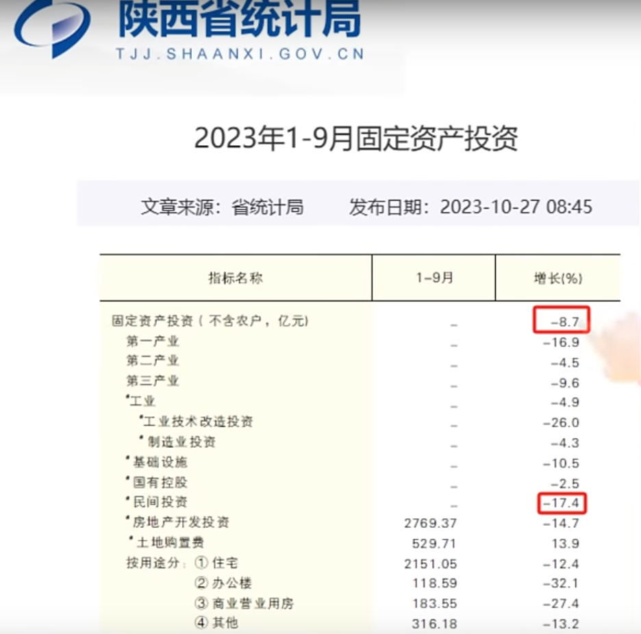 首先是陕西的固定资产投资数据。我直接放出陕西统计局官网的截图吧,今年1-9月陕西固定资产投资降幅达到8.7%**,其中民间投资降幅更是高达17.4%。无论第一第二第三产业所有的投资都是全线下跌,而在国家统计局那边,即使投资原始数据处于事实上的下降11.0%**的状态,但是国家统计局还是悍然宣布了一个前三季度投资增幅3.1%的数据。陕西现在这个投资负8.7%的数据,毫无疑问当然也还是美化过的结果,只不过是现实数据实在跌得太惨,美化不到正值罢了。