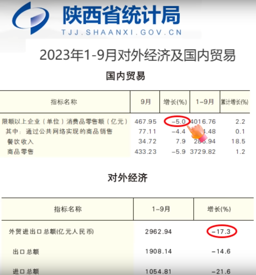 接下来是消费数据。我依然直接给出陕西省统计局的官网截图,陕西省发布的是限额以上消费数据,也就是有规模的消费企业的零售数据,9月份同比下降5.0%**,前三季度合起来也就是增长了2.2%而已。这个数据惨到什么程度呢?跟全国的数据对比一下,9月份全国限额以上消费数据增幅5.2%,前三季度的累计增幅是5.9%。也就是说在全国消费还维持着正增长的情况下陕西率先实现了消费萎缩,其实今年的消费有一定增长是很正常的,毕竟去年下半年全国新冠大爆发,很多城市一封就是几个月,火灾了都不许下楼,西安去年的封控政策在执行层面也极其严厉,2022年9月底西安还有两个高风险区和5个中风险区,这意味着西安当时的消费和旅游活动受到了极大的限制,外地人一下高铁要么就自费隔离七天要么就得被原地遣返。然而即使是这样,陕西今年9月的消费数据依然比不上去年9月份,这真是萧条到过不下去的程度了。**