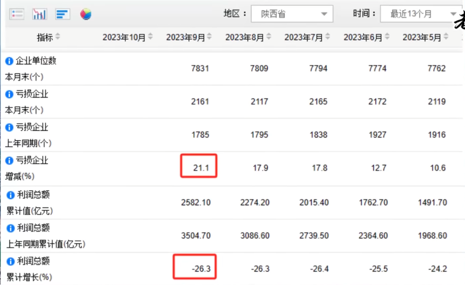 根据国家统计局的分省数据,今年9月份,陕西规模以上工业亏损企业数量从去年同期的1785个增加到2161个,增加了21.1%**;前三季度的企业利润则下降了足足26.3%**。而在国家统计局的口径里,全国前三季度的工业企业利润下降幅度也就是9.0%。