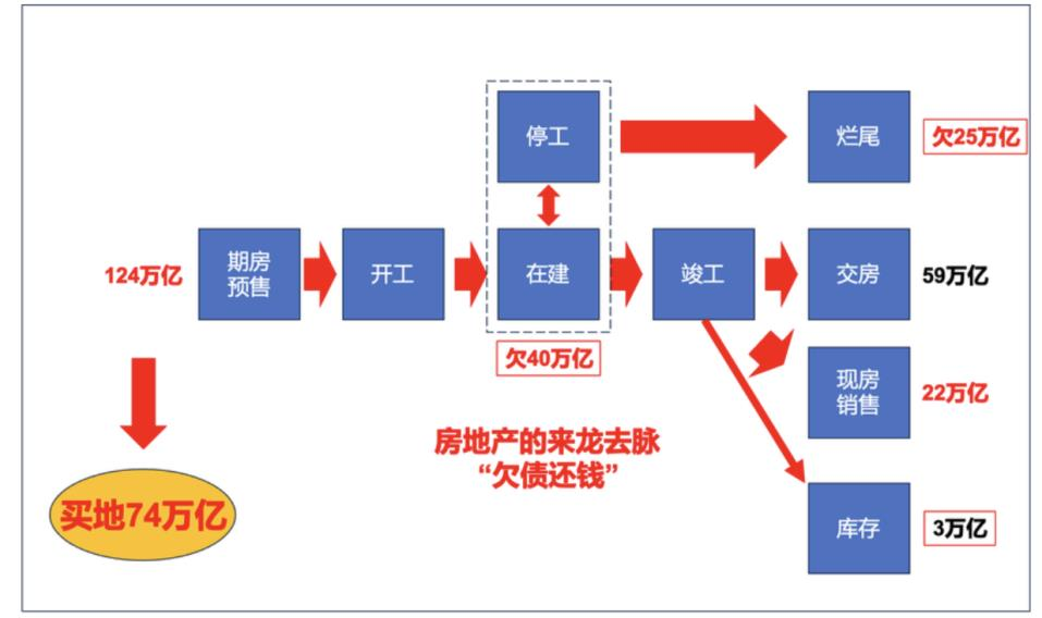 这张图,只用最简单的数学逻辑关系,描绘出了房地产危机的来龙去脉,以及危机本身的影响大小。从图中可以看出,目前的亏空高达 65 万亿人民币,需要有人补上。这个分析,数学不超过小学水平,最简单不过了。我相信绝大多数人都能理解。思考问题,凡是涉及数量的,一定要首先考虑数量级。房地产的窟窿高达 65 万亿,这钱早让政府拿去下大棋了,不可能退还。如果算上衍生效应,连带影响,上下游,买了烂尾楼的人,房地产危机的总体影响应该在上百万亿数量级。现在有人幻想的几万亿救助,实际上差了两个数量级,十万亿级,百万亿级。