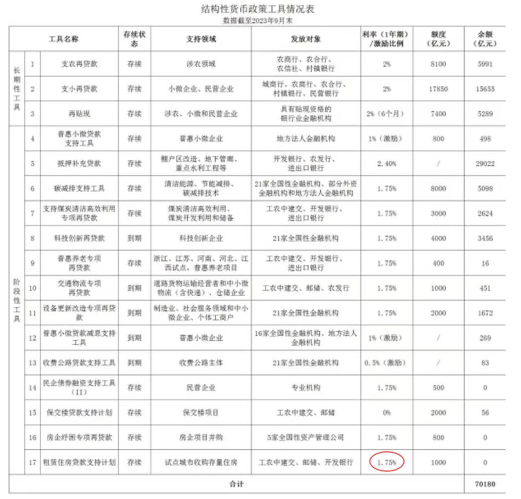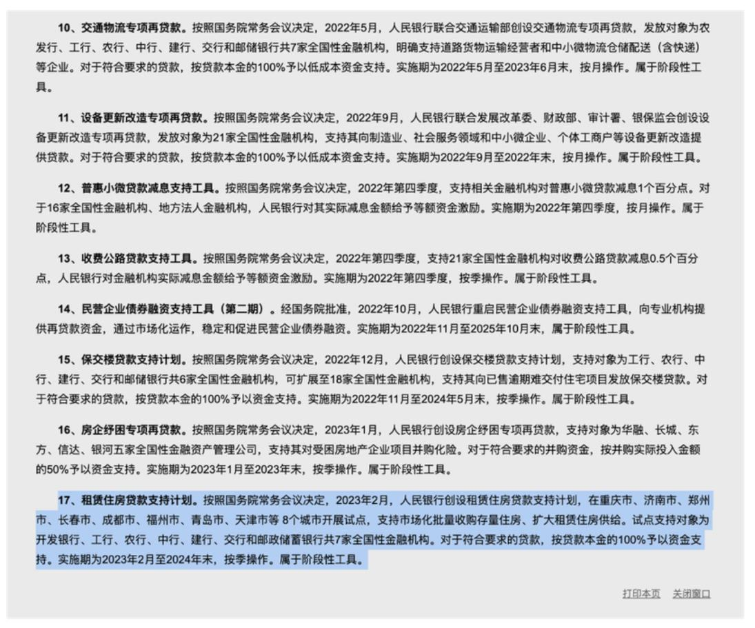 首先,央行在已有的“结构性货币政策工具”中添加了第 17 条工具:“17、租赁住房贷款支持计划。按照国务院常务会议决定,2023 年 2 月,人民银行创设租赁住房贷款支持计划,在重庆市、济南市、郑州市、长春市、成都市、福州市、青岛市、天津市等 8 个城市开展试点,支持市场化批量收购存量住房、扩大租赁住房供给。试点支持对象为开发银行、工行、农行、中行、建行、交行和邮政储蓄银行共 7 家全国性金融机构。对于符合要求的贷款,按贷款本金的 100%予以资金支持。实施期为 2023 年 2 月至 2024 年末,按季操作。属于阶段性工具。”注意,这里面是“按照贷款本金的 100%予以资金支持”,也就是说,商业银行发多少租赁住房贷款,央行给这些商业银行多少资金,利率仅有 1.75%,甚至低于7天逆回购利率。目前这个金额仅为 1000 亿,未来完全可以上调,毫无限制。