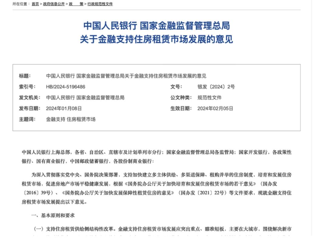 其次,2024 年一月 8 日,中国人民银行 国家金融监督管理总局发布了《关于金融支持住房租赁市场发展的意见》,明确了细则。